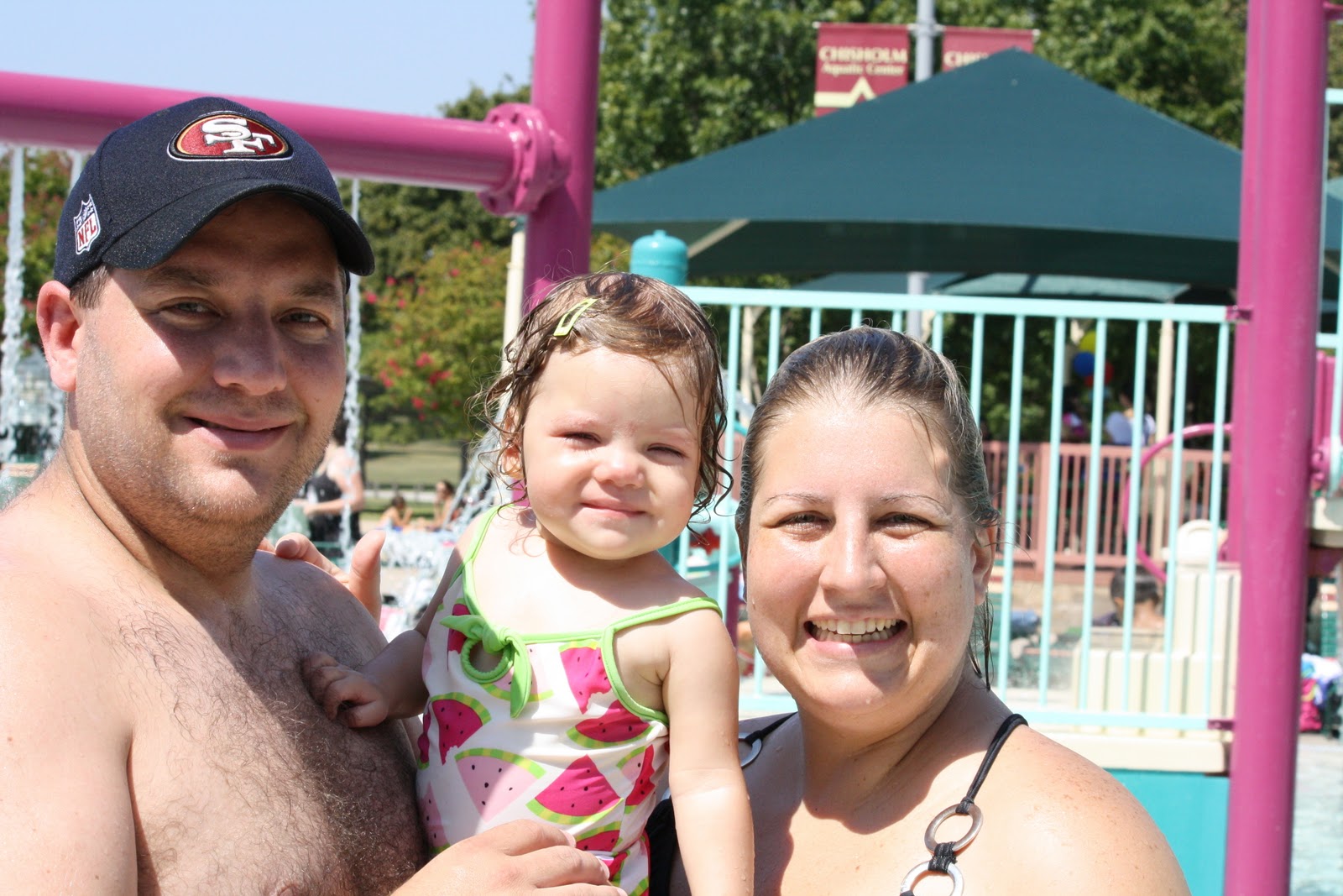 On Saturday, we went to the Hurst water park. Hurst is the actual city that Alexis and Ashley live in. The city has this neat little local spot to cool off at. It is VERY kid friendly, but it does offer a couple of “big kid” slides. If you are a Hurst resident (and can prove it) the cost is $1. For everyone else, it is only $5! (Not bad for all of the fun that it offers.) Everyone had a great time. Kendall and Mason played in the “sprinkler” section, the adults took turns watching the kids and going down the big slides, and poor Tucker slept through the whole thing. We got some great pictures…especially of everyone going down the slide.